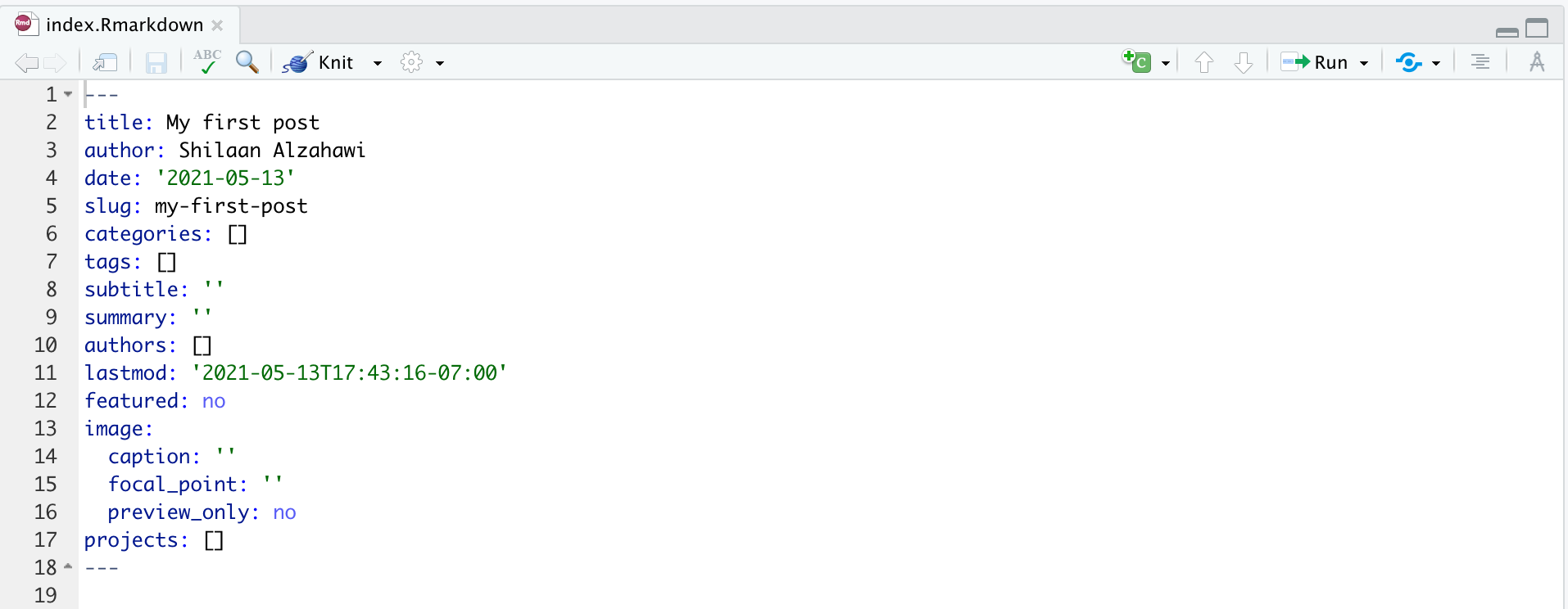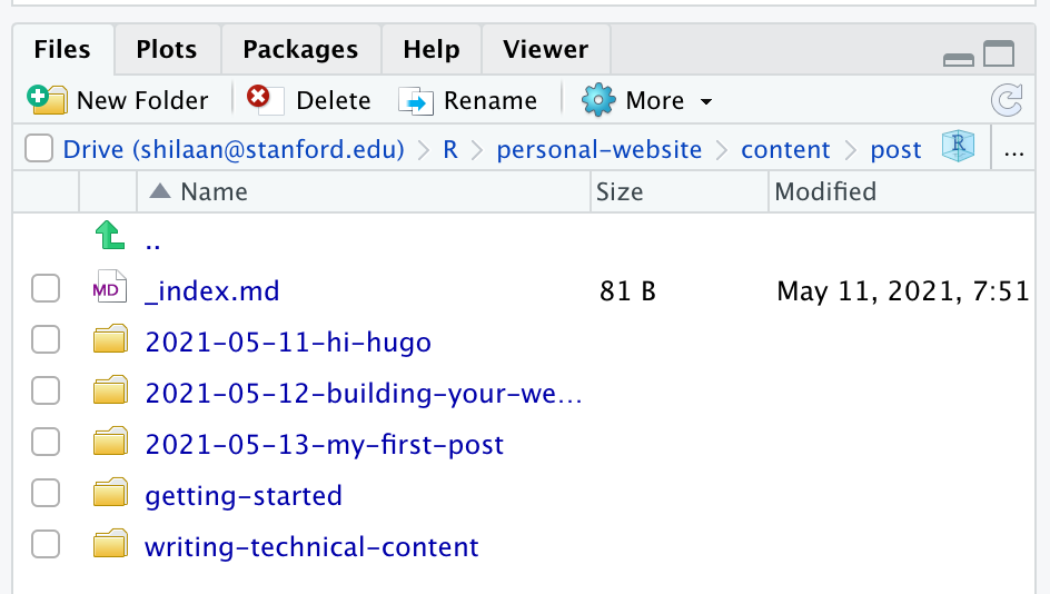 In your Files pane, you will now have a folder (under content/post) with today’s date and the title of your post. The crucial file is index.Rmarkdown: this is where you will write your post.