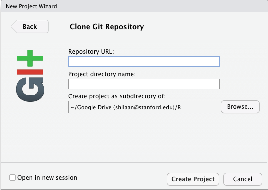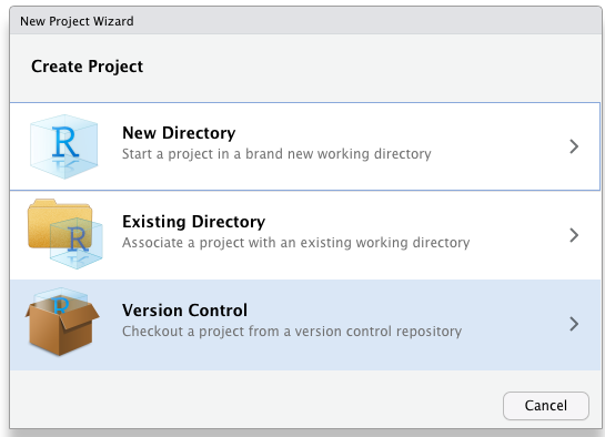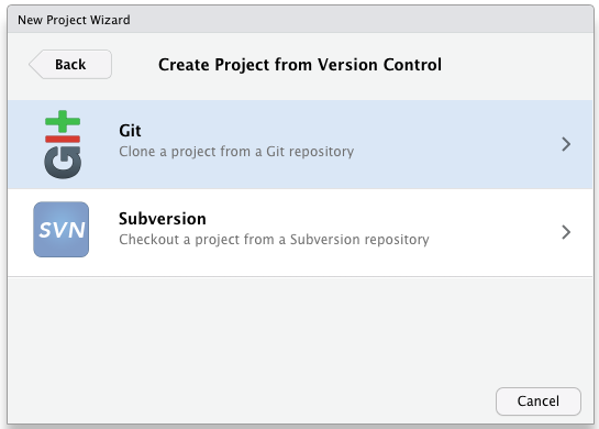 ☞ Go to RStudio > File > New Project > Version Control > Git
