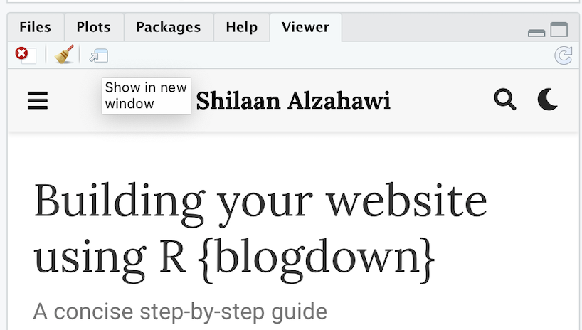 “Show in new window” icon next to the 🧹 to preview your site in a browser window.